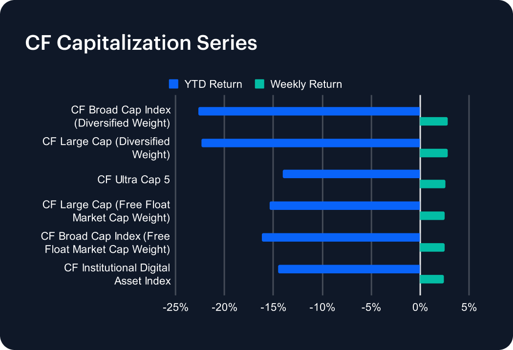 The CF Capitalization Series rebounded modestly this past week, with all major indices posting gains. Diversified-weighted indices slightly outperformed their free-float weighted counterparts. The CF Broad Cap Index (Diversified Weight) led with a 2.84% weekly gain, trimming its year-to-date (YTD) loss to -22.65%. The CF Large Cap Index (Diversified Weight) followed closely, rising 2.80% for the week. Among free-float market cap-weighted indices, both the CF Broad Cap Index and CF Large Cap Index advanced 2.48%, with their YTD returns improving to -16.20% and -15.39%, respectively. The CF Institutional Digital Asset Index added 2.47%, while the CF Ultra Cap 5 climbed 2.55%, bringing its YTD return to -14.04%. Despite the bounce, YTD performance remains in negative territory across the board.