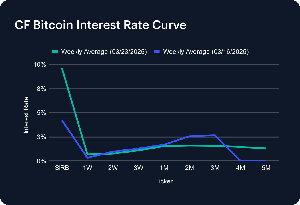 The CF Bitcoin Interest Rate Curve rose meaningfully over the past week, with short-term rates leading the move higher. The Short-Term Interest Rate Benchmark (SIRB) nearly doubled, climbing to 9.61% from 4.20%, reflecting a sharp increase in borrowing costs. The 1-Week rate rose to 0.67% from 0.32%, while the 2-Week and 3-Week tenors declined slightly to 0.76% and 1.09%, respectively. The 1-Month rate eased to 1.53%. Medium-term rates continued to fall, with the 2-Month and 3-Month tenors dropping to 1.59% and 1.56%. Notably, the 4-Month and 5-Month rates reappeared on the curve, settling at 1.44% and 1.29%, indicating renewed market engagement in longer-term borrowing.
