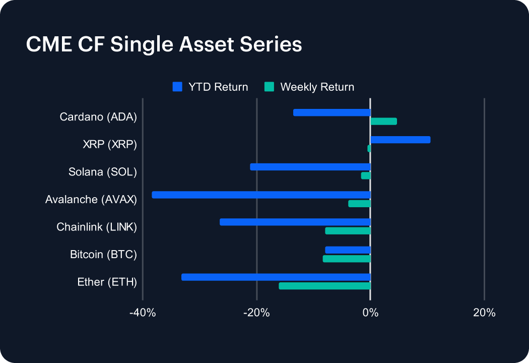 The digital asset market remained turbulent over the past week, with Bitcoin (BTC) and Ether (ETH) leading the downturn. BTC dropped -8.32%, erasing its previous gains and bringing its YTD return to -7.98%. ETH fared worse, plunging -16.09% weekly and extending its YTD loss to -33.19%. Chainlink (LINK) also faced significant pressure, declining -8.01% for the week, deepening its YTD loss to -26.53%. Avalanche (AVAX) slipped -3.87%, now down -38.37% YTD. Solana (SOL) continued its slide, falling -1.59% and accumulating a -21.11% YTD decline. In contrast, Cardano (ADA) saw a modest rebound, gaining 4.59% weekly but still down -13.53% YTD. XRP remained relatively stable, dipping -0.53% but holding a positive YTD return of 10.56%.