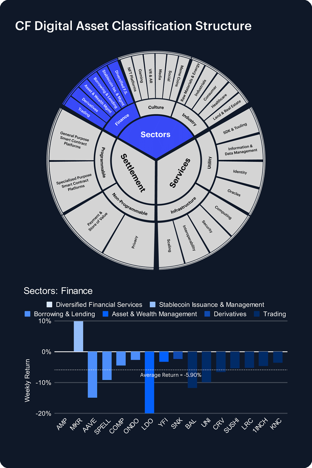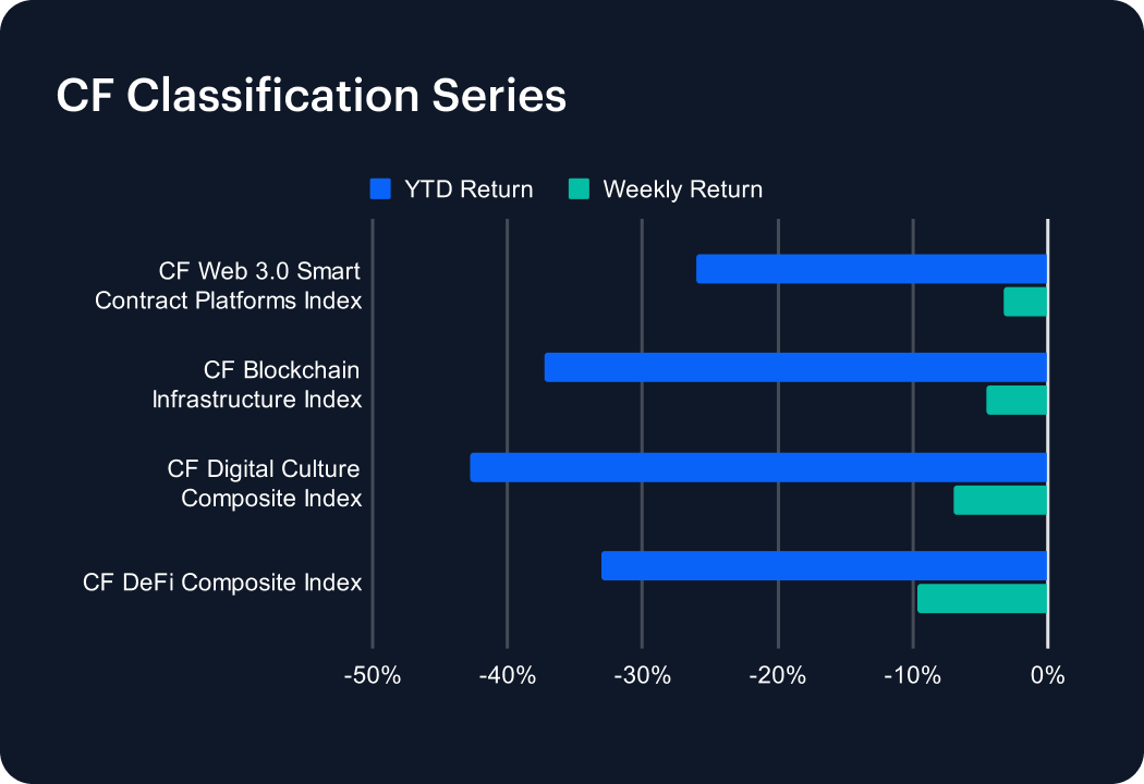 The CF Classification Series experienced broad declines this past week, signaling continued pressure across digital asset verticals. The CF DeFi Composite Index led the downturn, plunging -9.71% for the week and deepening its YTD decline to -33.02%. The CF Digital Culture Composite Index followed closely, falling -6.99%, bringing its YTD loss to -42.75%. The CF Blockchain Infrastructure Index also struggled, shedding -4.59% and extending its YTD drop to -37.25%. Meanwhile, the CF Web 3.0 Smart Contract Platforms Index saw a relatively smaller decline of -3.26%, with its YTD return slipping further to -26.08%. This week’s selloff underscores persistent challenges across sectors, as sentiment remains weak and market conditions continue to weigh on digital asset performance.
