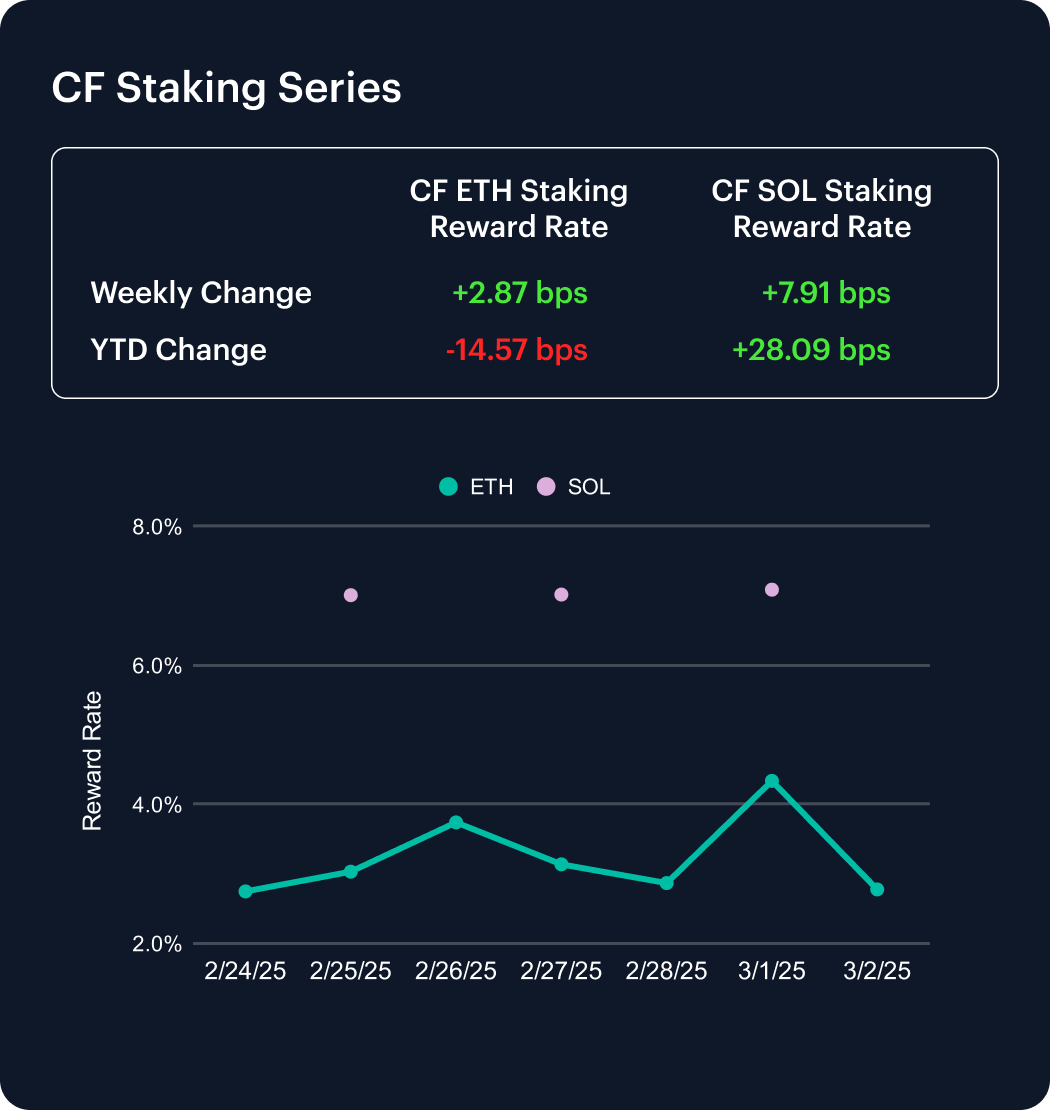Meanwhile, the CF SOL Staking Reward Rate Index (SOL_SRR) continued its upward trajectory, climbing 7.91 basis points to 7.09%, marking a 1.13% weekly gain and a strong 28.09 bps YTD increase. These movements highlight Solana’s sustained staking yield growth, while Ethereum’s reward rate remains volatile with a downward YTD trend.