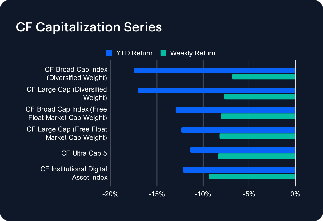 Our CF Capitalization Series saw broad-based declines this past week, with free-float market cap-weighted indices underperforming their diversified-weighted counterparts. The CF Institutional Digital Asset Index led the downturn, falling -9.38% for the week, bringing its YTD loss to -12.15%. The CF Ultra Cap 5 also struggled, dropping -8.34%. Among free-float market cap-weighted indices, the CF Large Cap Index declined -8.22%, while the CF Broad Cap Index fell -8.04%, deepening their YTD losses to -12.30% and -12.94%, respectively. Diversified-weighted indices fared slightly better, with the CF Large Cap Index down -7.72% and the CF Broad Cap Index declining -6.85%. Market sentiment remains cautious, with large-cap assets facing sustained pressure amid widespread corrections.