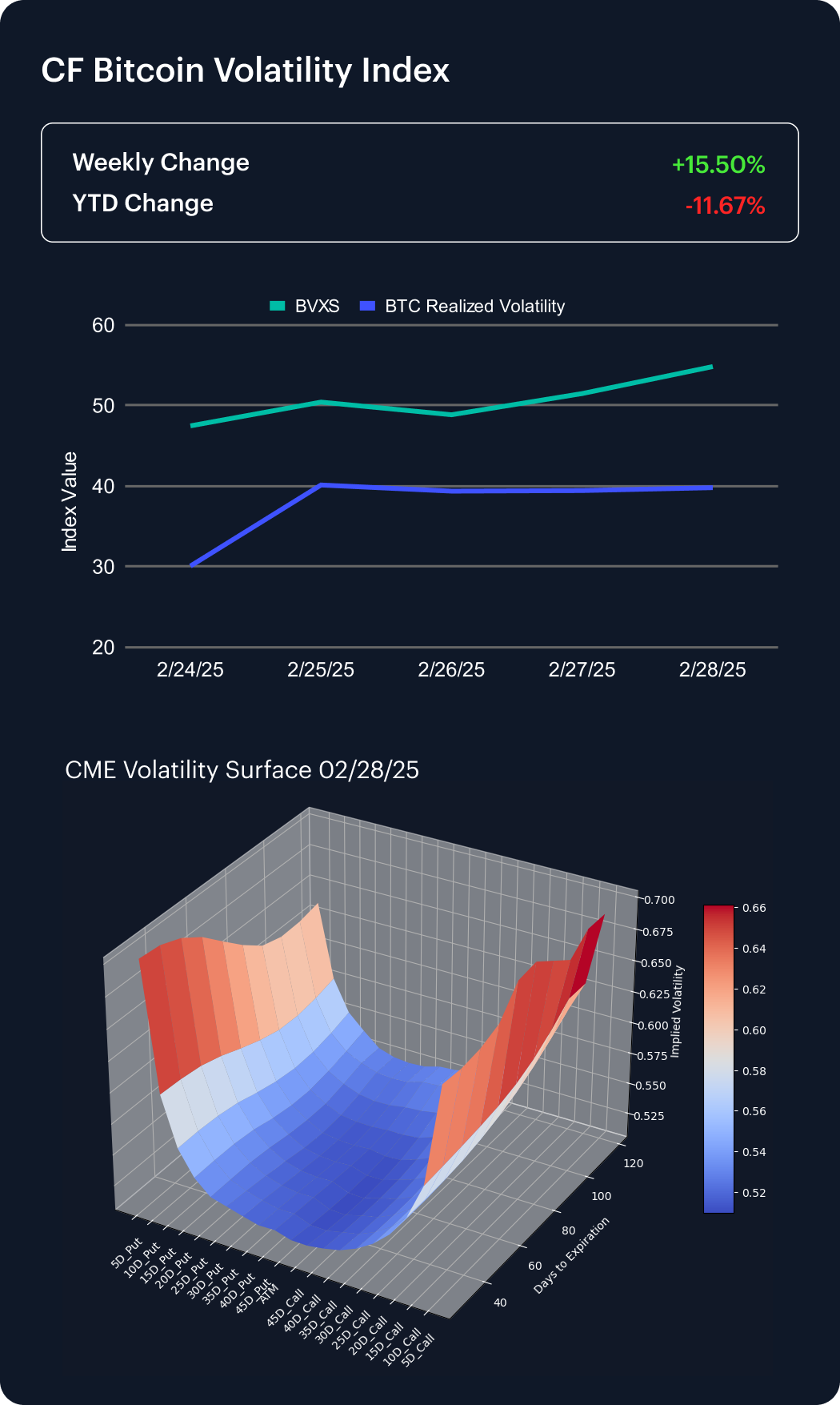 The CF Bitcoin Volatility Index Settlement Rate (BVXS) rebounded this past week, rising 15.50% to settle at 54.85, though it remains down -11.67% YTD. Realized volatility also increased notably, starting the week at 30.09 and climbing to 49.82, signaling heightened short-term price fluctuations.