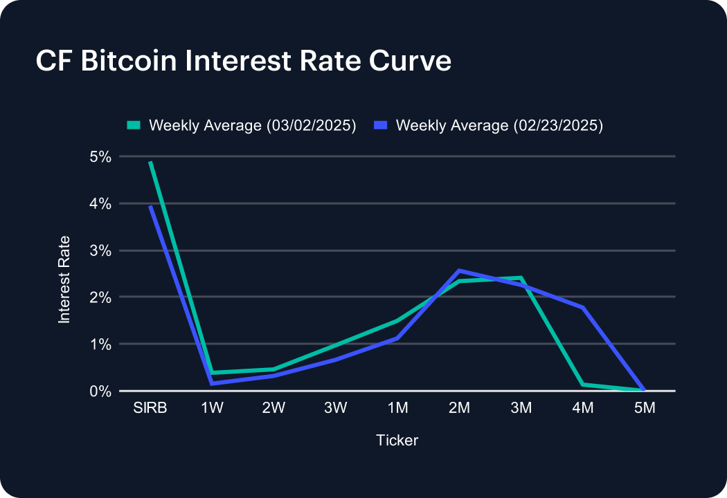 The CF Bitcoin Interest Rate Curve saw a broad adjustment this past week, with short-term rates rising while medium- and long-term tenors exhibited mixed movements. The SIRB increased to 4.89%, up from 3.95% the previous week, reflecting a slight increase in short-term borrowing costs. The 1-Week and 2-Week rates climbed to 0.39% and 0.46%, respectively, while the 3-Week and 1-Month tenors rose to 0.97% and 1.49%. Medium-term rates were mixed, with the 2-Month rate declining to 2.34%, while the 3-Month rate edged up to 2.41%. The 4-Month tenor saw a sharp drop to 0.13%. These shifts suggest fluctuating liquidity conditions and changing borrowing dynamics across maturities.