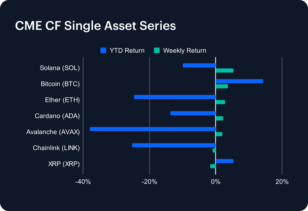 The digital asset market extended its rally last week, with several major tokens posting gains. Solana (SOL) led the charge, jumping 5.40% and trimming its year-to-date (YTD) loss to -9.93%. Bitcoin (BTC) continued to show strength, rising 3.62% to lift its YTD return to 14.38%, the highest among large-cap tokens. Ether (ETH) climbed 2.88%, though it remains down 24.70% for the year. Cardano (ADA) and Avalanche (AVAX) added 2.25% and 2.00%, respectively, offering relief amid deeper YTD declines. On the downside, Chainlink (LINK) slipped 1.01%, and XRP (XRP) dropped 1.64%, though XRP still holds a positive YTD return of 5.29%. The market’s mixed performance reflects cautious optimism as the macroeconomic environment continues to shift.