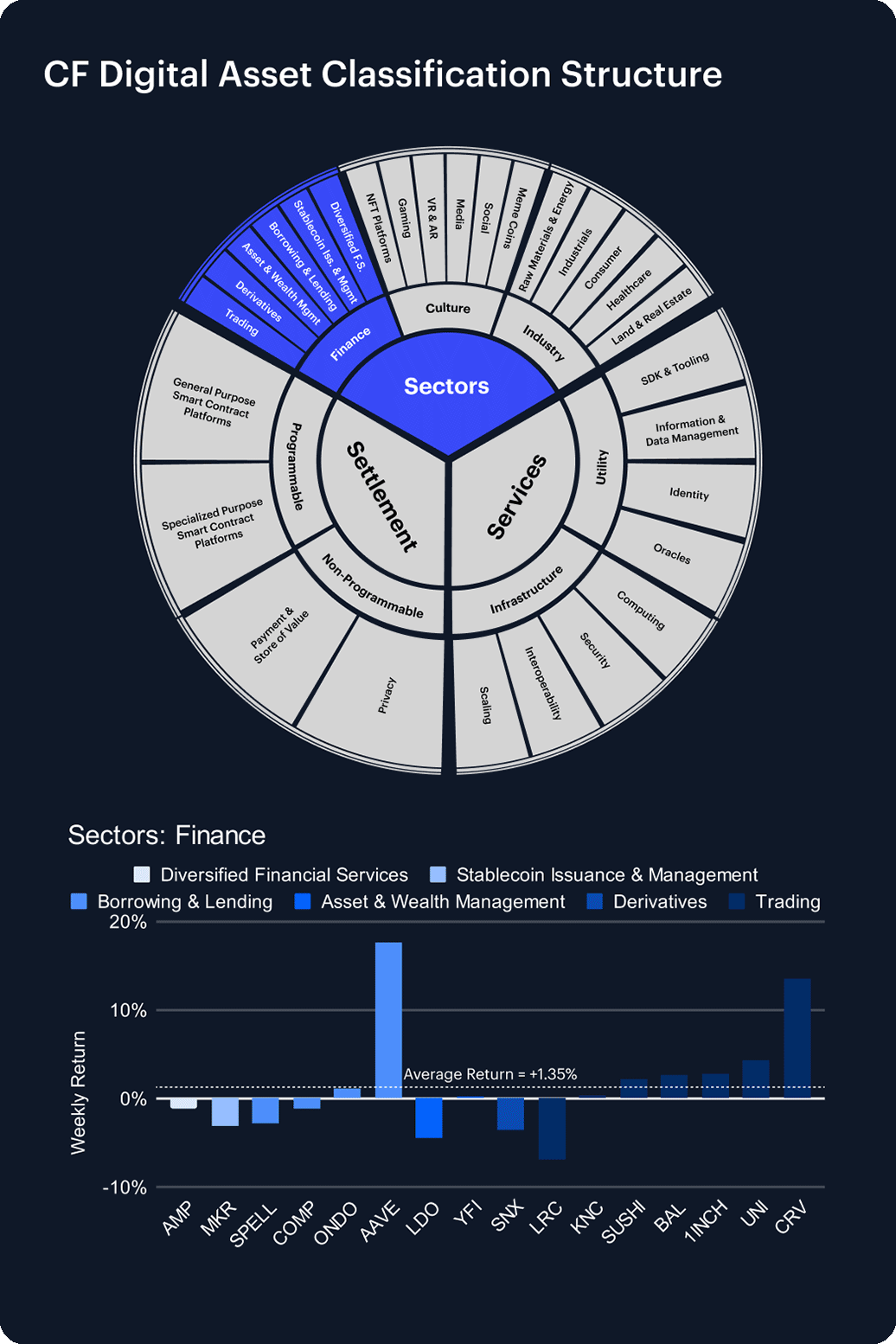 Key digital asset sub-categories showed a mixed performance last week, with pockets of strength emerging across segments. In Trading, CRV surged 13.55%, far outpacing the average in the trading segment, while UNI and BAL posted modest gains. AAVE led Borrowing & Lending with a strong 17.62% rally, contrasting with mild losses in SPELL and COMP. In Smart Contract Platforms, Solana (SOL) gained 5.40%, topping the segment, while Fantom (FTM) lagged with a steep 9.70% drop. Notably, Injective (INJ) jumped 9.18% among specialized platforms. In Gaming and Culture, SUPER edged higher by 2.17%, but PRIME tumbled 11.65%. Scaling tokens were broadly positive, led by OP (+4.06%), while BICO in SDK & Tooling sank 10.65%. Overall, strength was selective across the DACS sub-categories.