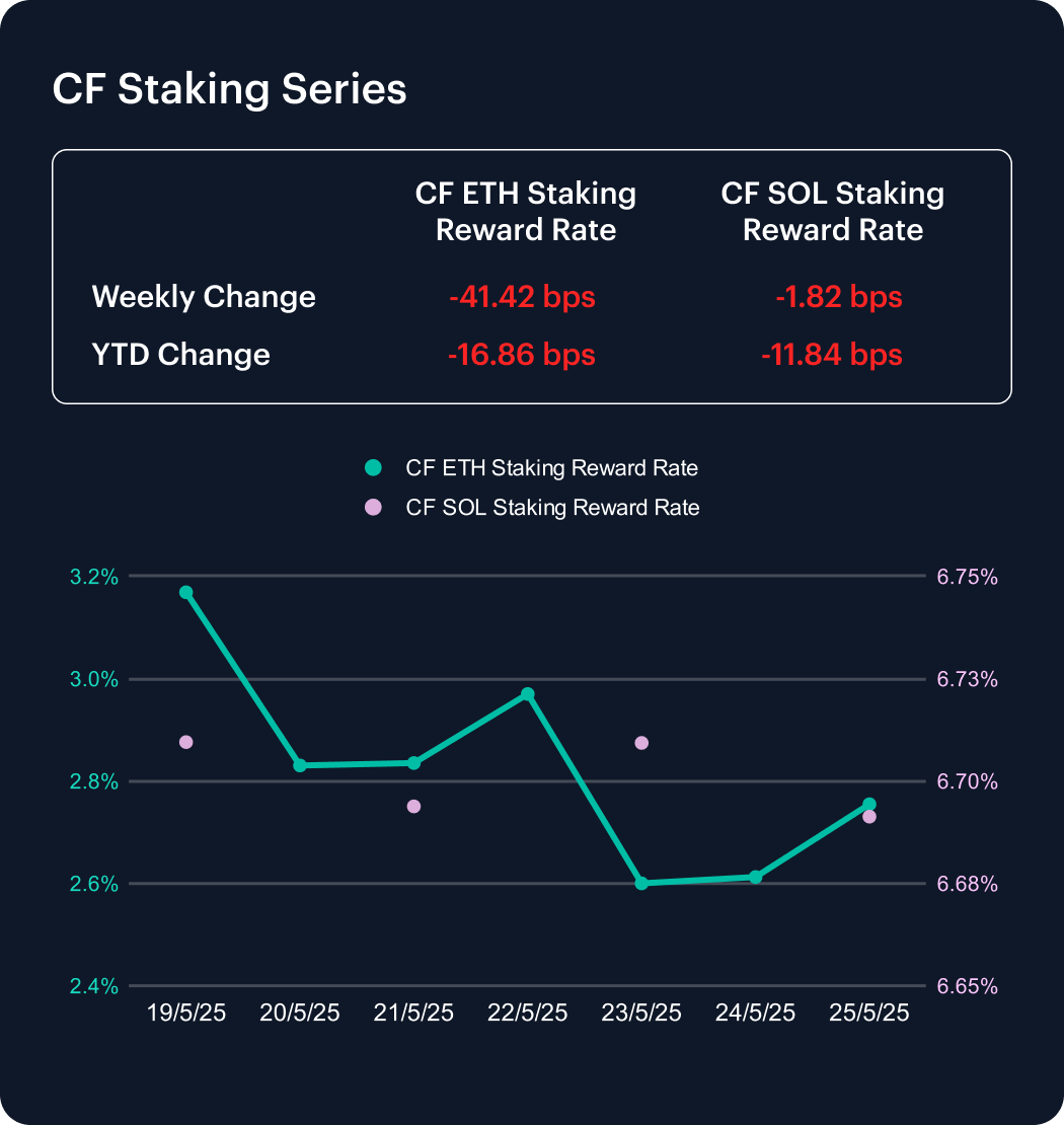 The CF Ether Staking Reward Rate Index (ETH_SRR) fell sharply last week, dropping 41.42 basis points to 2.75%—a 13.07% weekly decline. Year-to-date, the index has declined 16.86 bps from 2.92%, reflecting a 5.77% decrease and pointing to continued downward pressure on Ethereum staking yields.