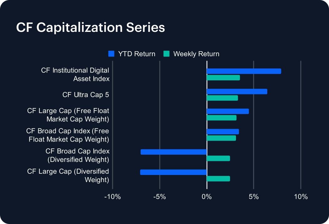 The CF Capitalization Series advanced broadly last week, with gains across both free-float and diversified-weighted indices. The CF Institutional Digital Asset Index led with a strong 3.53% weekly gain, lifting its year-to-date (YTD) return to 7.89%. The CF Ultra Cap 5 followed closely, rising 3.30% for a 6.43% YTD return. Free-float market cap-weighted benchmarks also posted solid gains—CF Large Cap and CF Broad Cap Index climbed 3.14% and 3.13%, respectively, boosting YTD returns to 4.48% and 3.45%. Diversified-weighted indices also rebounded as the CF Broad Cap and CF Large Cap rose 2.50% and 2.48%, though YTD returns remain negative at -7.04% and -7.09%. The outperformance by the CF Institutional Digital Asset Index highlights the strong investor appetite for Bitcoin in 2025.