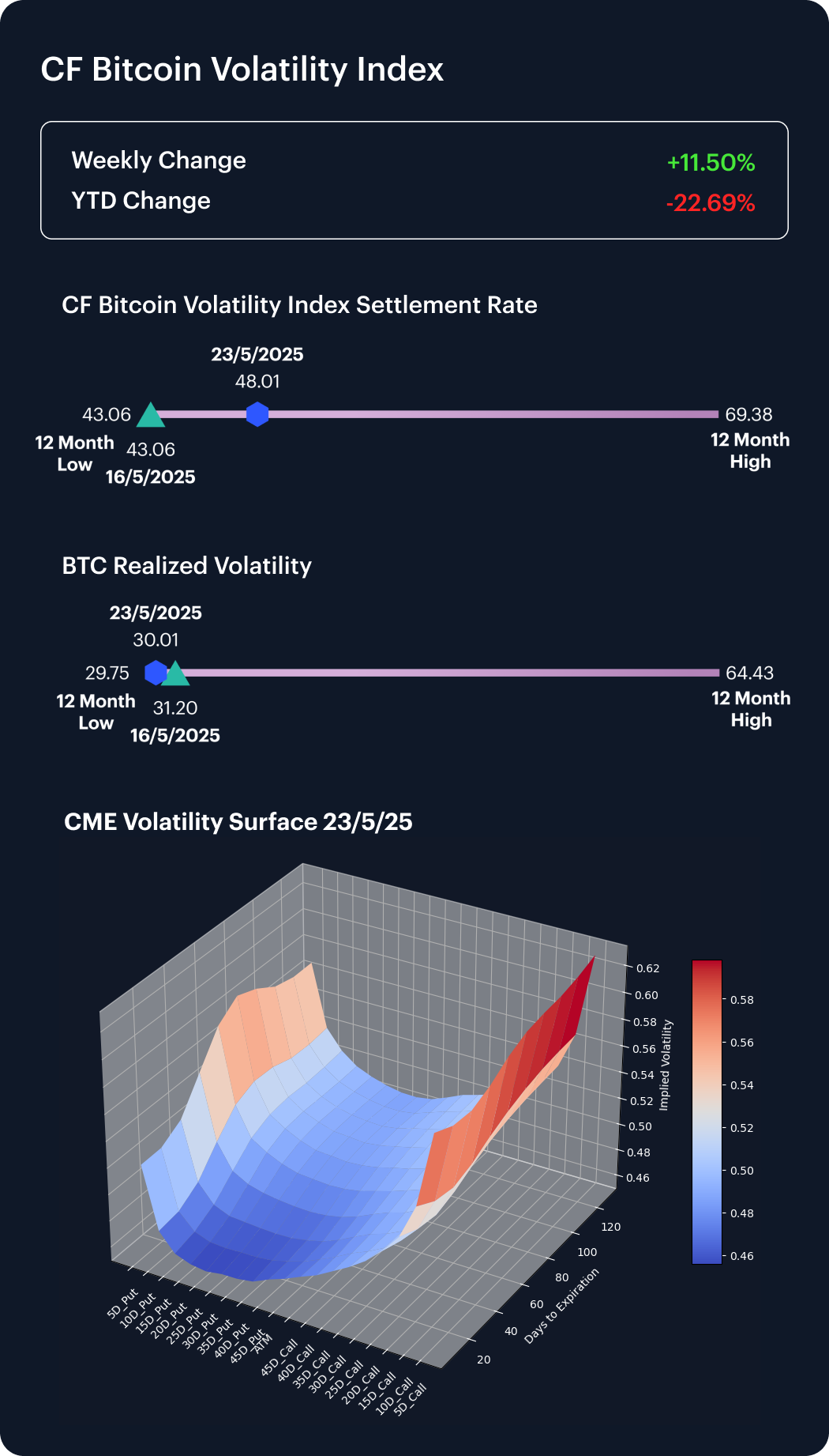 The CF Bitcoin Volatility Index Settlement Rate (BVXS) climbed sharply last week, rising 5.95 points to 48.01—a notable 11.50% increase that trims its year-to-date decline to 22.69%. The rebound in implied volatility suggests a renewed demand for hedging or directional exposure, likely tied to shifting expectations around macro or crypto-specific catalysts.