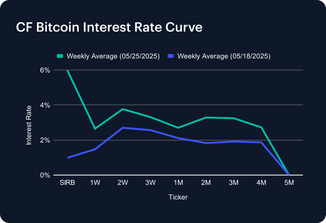 The CF Bitcoin Interest Rate Curve rose sharply last week, reversing the prior decline as funding costs climbed across nearly all tenors. The Short-Term Interest Rate Benchmark (SIRB) surged to 5.99% from 0.98%, indicating a renewed spike in near-term borrowing demand. The 1-week and 2-week rates increased to 2.65% and 3.77%, respectively, reflecting stronger appetite for short-duration leverage. Mid-curve tenors also moved higher, with the 1-month rate reaching 2.70%, and 2- to 4-month maturities rising steadily. The 5-month tenor remained flat at zero. The broad curve steepening suggests a return of speculative positioning and short-term risk-taking.