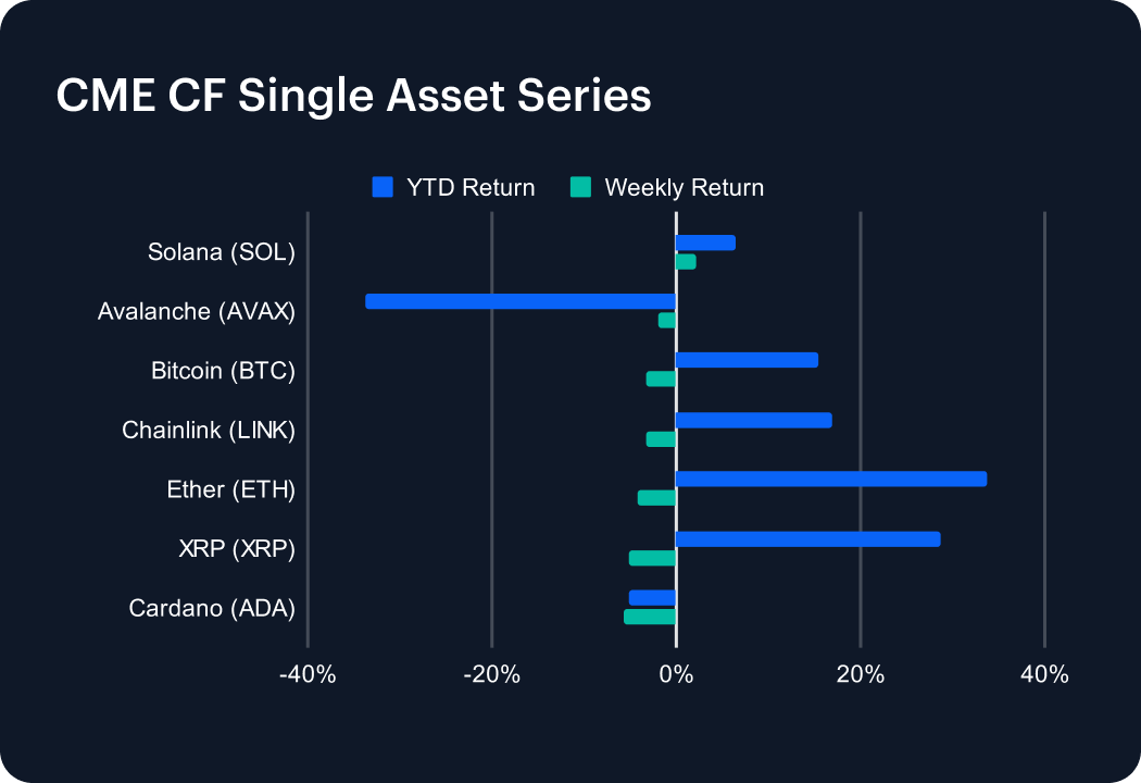Digital assets advanced over the past week amid signs of caution. XRP rose 7.4%, outshining BTC's +5.8% and ETH's +5.5%. Volatility stabilized, with the BVXS implied vol. gauge +0.57 of a point and realized vol. +2.90. Key CF DACS averages rose, and CF BIRC funding rates were mostly steady.