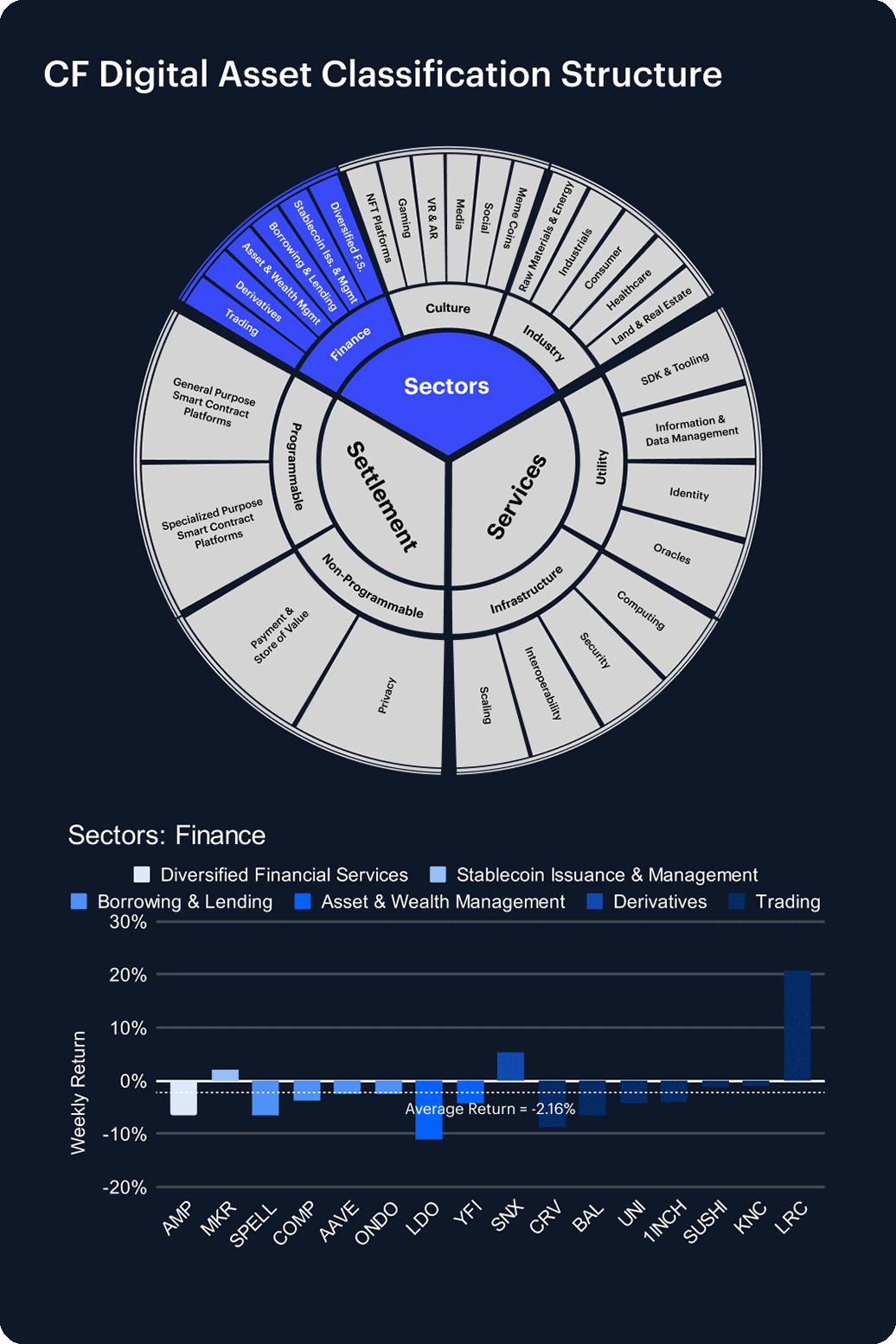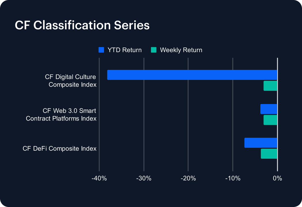 Last week brought renewed weakness across the CF Classification Series, as risk-sensitive sectors struggled to sustain momentum. The CF Digital Culture Composite Index slipped 3.12%, deepening its year-to-date decline to –38.19% and underscoring persistent headwinds in high-beta tokens. The CF Web 3.0 Smart Contract Platforms Index fell 3.16%, dragging its 2025 return further into negative territory at –3.84%. The CF DeFi Composite Index posted the steepest pullback, dropping 3.72% to leave it down –7.45% year-to-date. The declines highlight how speculative themes remain under pressure, with conviction across digital asset verticals still fragile.