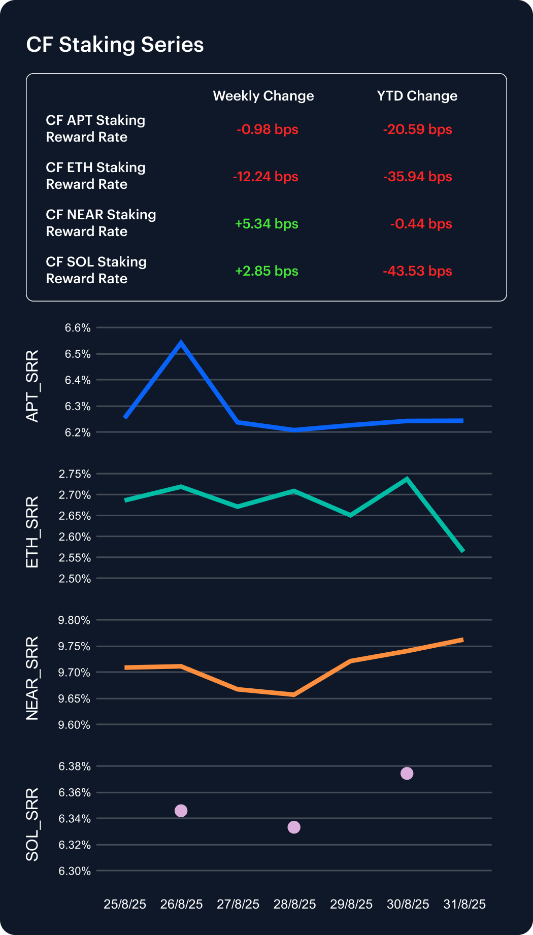 Despite a range of weekly moves, all major staking reward rates remain lower on the year. NEAR once again stood out, its annualized reward rate rising 5.34 bps to 9.76%, leaving its year-to-date decline at just –0.44 bps (–0.05%). Solana also firmed, gaining 2.85 bps to 6.37%, though its cumulative 43.53 bps erosion keeps it one of 2025’s weaker performers at –6.39%. Aptos remained subdued, slipping 0.98 bps to 6.24% and extending its YTD decline to –20.59 bps (–3.19%). Ethereum was the clear laggard, falling 12.24 bps to 2.56%, deepening its annual decrease to –35.94 bps (–12.29%), the sharpest among majors. The dispersion underscores how validator economics remain uneven.