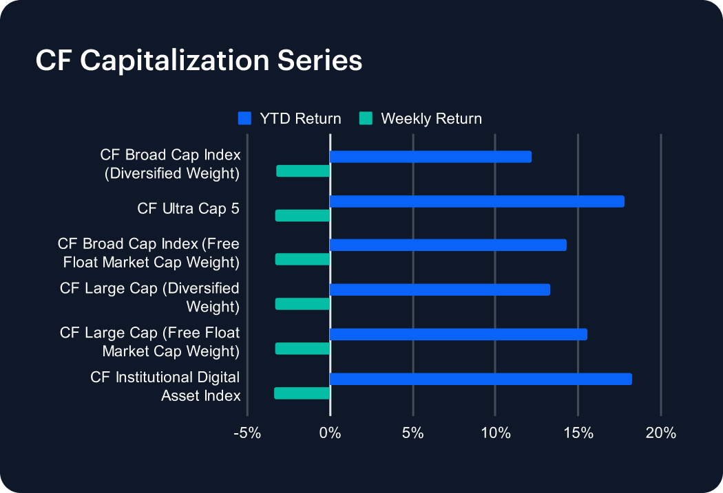 Momentum faltered in the CF Capitalization Series last week, as all major benchmarks slipped into negative territory. The CF Broad Cap (Diversified Weight) declined 3.26%, trimming its 2025 gain to 12.16%, while the CF Large Cap (Diversified Weight) fell 3.30% but still holds a 13.28% advance year-to-date. Free-float measures moved in tandem, with the CF Broad Cap Index off 3.29% (YTD 14.28%) and the CF Large Cap (Free Float) down 3.31%, leaving it up 15.57% for the year. Among flagships, the CF Ultra Cap 5 retreated 3.29%, yet retains a robust 17.78% advance in 2025. The CF Institutional Digital Asset Index lagged slightly, sliding 3.40%, though it remains the top performer with an 18.25% annual gain.