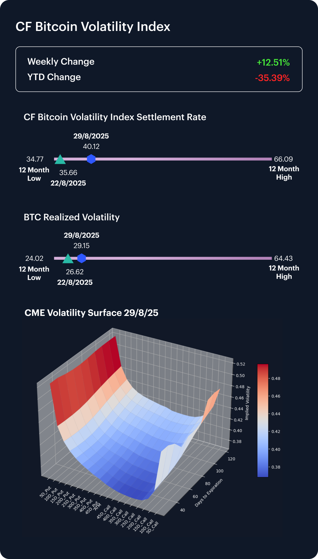 The CF Bitcoin Volatility Index Settlement Rate (BVXS) surged 12.51% last week, climbing from 35.66 to 40.12, though it remains 35.39% below its January level and still above the 12-month low of 34.77. Realized volatility tracked higher in tandem, rising from 26.62 to 29.15, reinforcing the recent convergence between implied and spot measures. Beneath the surface, skew shifted further into negative territory, as demand for downside protection increased and 5-delta put implied volatility rose meaningfully across maturities. Convexity also expanded, leaving short-dated options softer while longer-dated structures continue to embed heavier tail risks. The overall setup reflects persistent caution, with markets recalibrating around asymmetric downside despite relatively contained realized volatility.