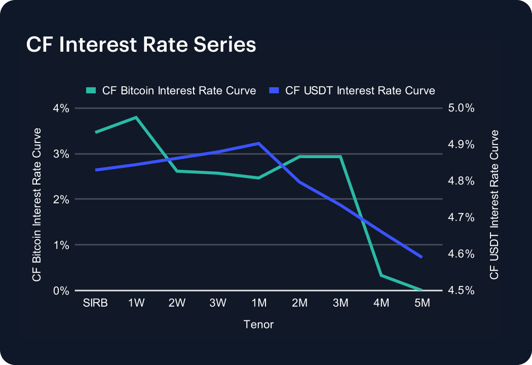 USDT funding remained firm, with the curve holding between 4.83% and 4.90% across the front end before easing steadily to 4.59% at five months. While well below prior 8% prints, the structure stays modestly downward-sloping, reflecting persistent demand for stablecoin liquidity even as borrowing costs normalize. The front-end premium highlights appetite for immediate USDT access, while softer levels further out suggest expectations for gradual easing. By contrast, the Bitcoin funding curve weakened further, slipping from 3.79% at one week to near zero beyond four months, underscoring the differentiated role of stablecoins as leverage collateral relative to BTC.