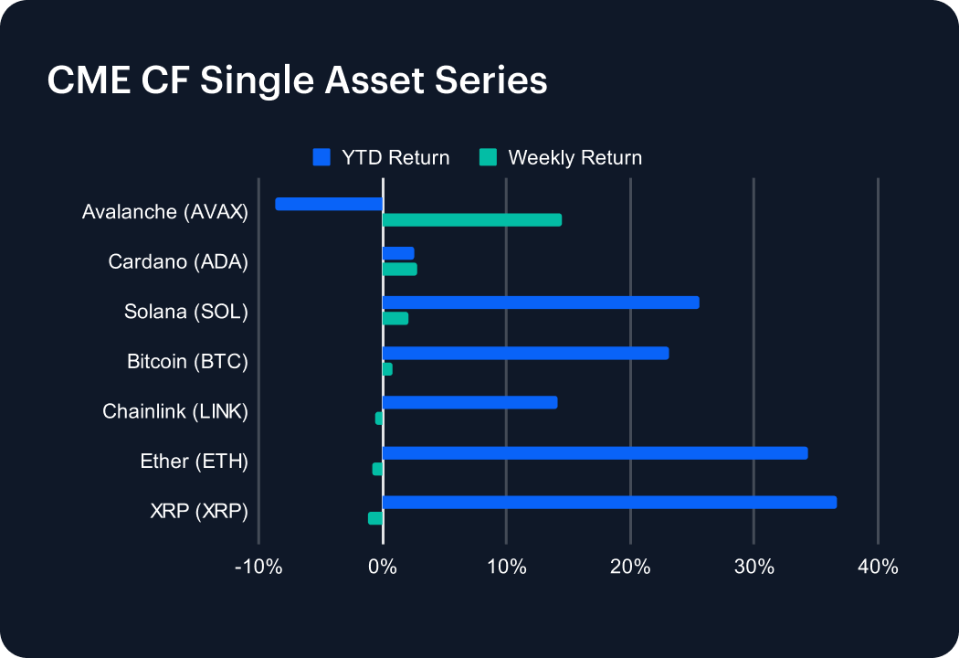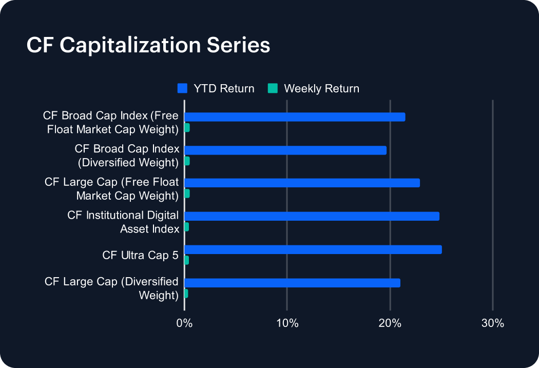 Capitalization-weighted indices showed a marked deceleration, as the broad-based rally of the previous week gave way to muted gains. The CF Broad Cap indices — both diversified and free float weighted — cooled to about 0.5% after advancing more than 5% the week prior, trimming their year-to-date returns to the high teens. The Ultra Cap 5 and Institutional Digital Asset Index each added only 0.5%, down from 3–4% a week earlier, though both still show robust YTD gains of around 25%. Large Cap benchmarks echoed the same pattern, underscoring that leadership narrowed significantly, with Bitcoin providing stability but altcoin weakness weighing on aggregate capitalization indices.