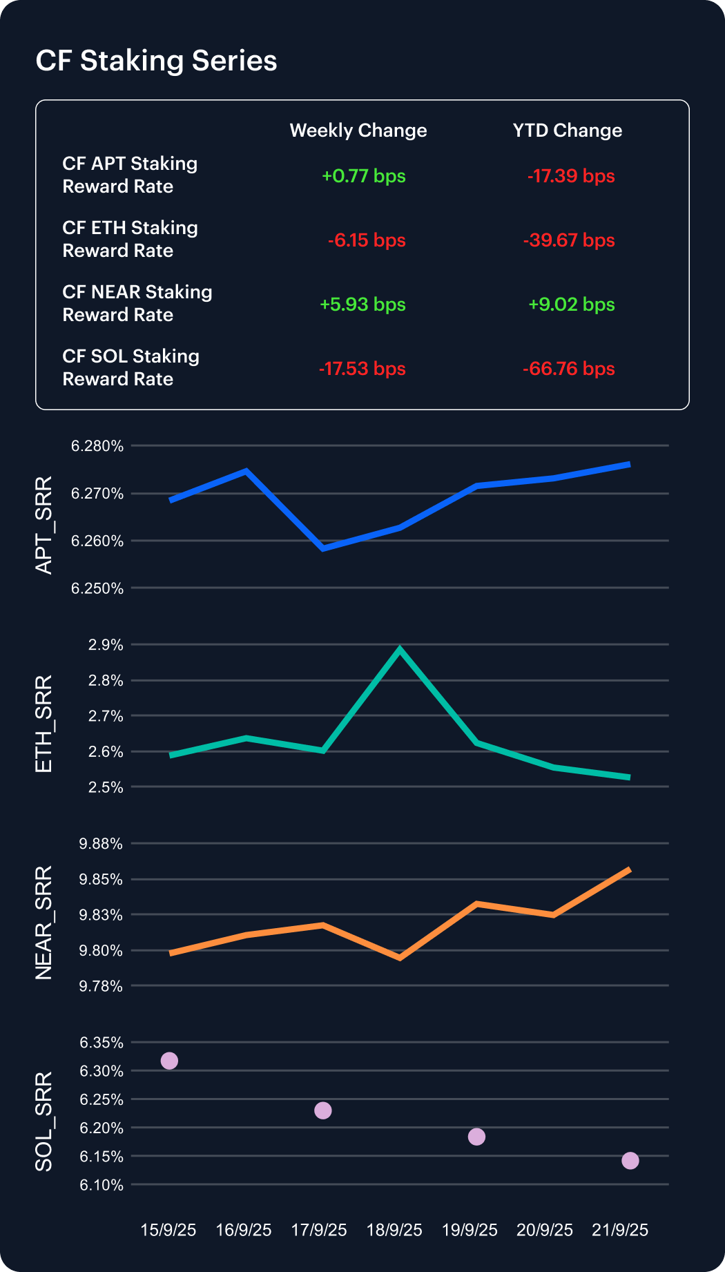 Staking performance split cleanly this week: NEAR (+0.61%) and APT (+0.12%) posted gains, while SOL (-2.77%) and ETH (-2.38%) declined; rate changes echoed the move, with NEAR (+5.93 bps) and APT (+0.77 bps) edging higher against pullbacks in SOL (-17.53 bps) and ETH (-6.15 bps). Year to date, NEAR (+0.92%) remains marginally positive, whereas APT (-2.70%), SOL (-9.80%), and ETH (-13.57%) are still negative—underscoring a week where leadership came from NEAR and APT, with ETH and SOL lagging.