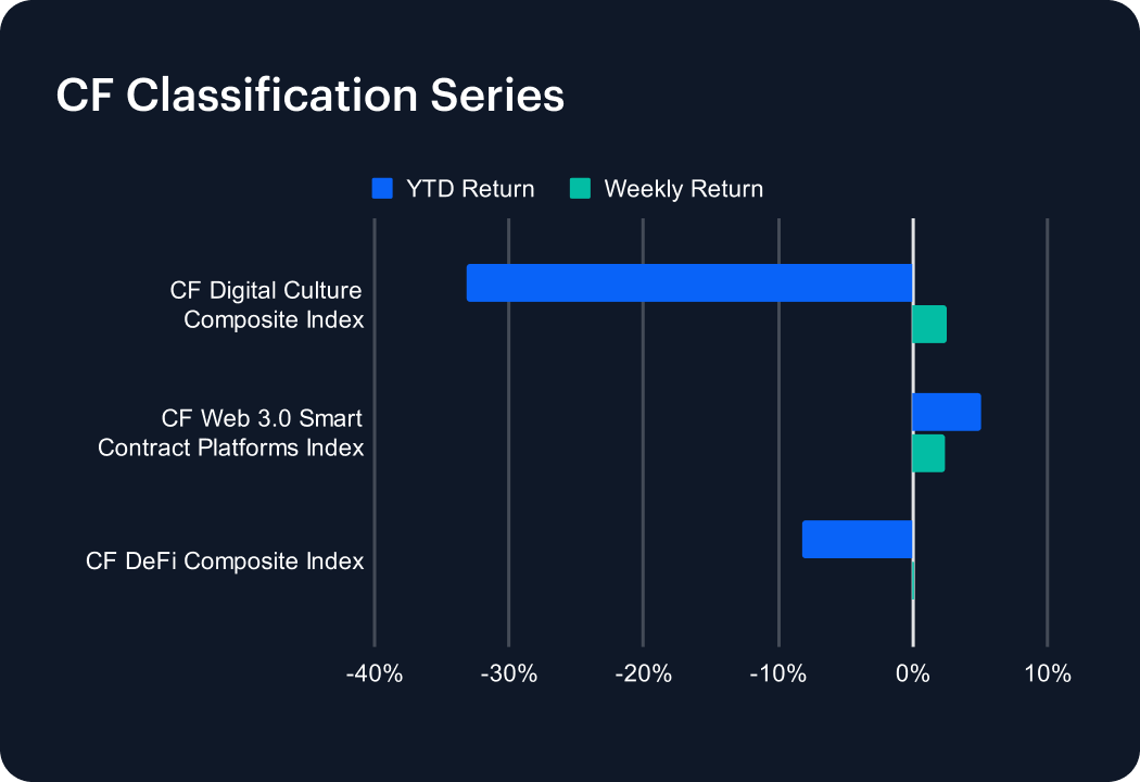 Thematic performance narrowed considerably after a strong prior week. Smart Contract Platforms came off a robust 7.0% gain and stalled, leaving year-to-date returns modestly positive at around 5%. The Digital Culture Composite also paused after last week’s 5.7% advance, but the sector remains firmly underwater in 2025 with losses of more than 30%. DeFi tokens slipped back into neutral, flat for the week and extending YTD weakness to about -8%. The pullback across classifications underscores how last week’s broad thematic surge failed to sustain momentum, with only Smart Contract Platforms still showing net positive progress for the year.
