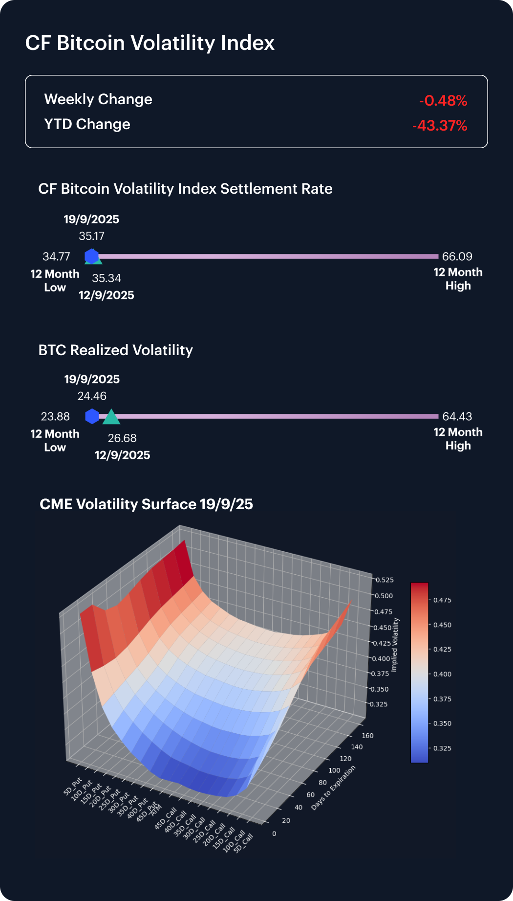 Bitcoin implied volatility eased further, with the CF Bitcoin Volatility Index slipping to the mid-30s after briefly touching 37 earlier in the week. Realized volatility was steady near 27%, underscoring the lack of follow-through in spot price swings. The modest weekly decline extended the broader trend of suppressed option premiums, leaving implied vol down more than 40% year-to-date. With realized and implied metrics converging at historically low levels, market participants continue to price in a relatively calm environment, even as broader crypto indices saw momentum fade.