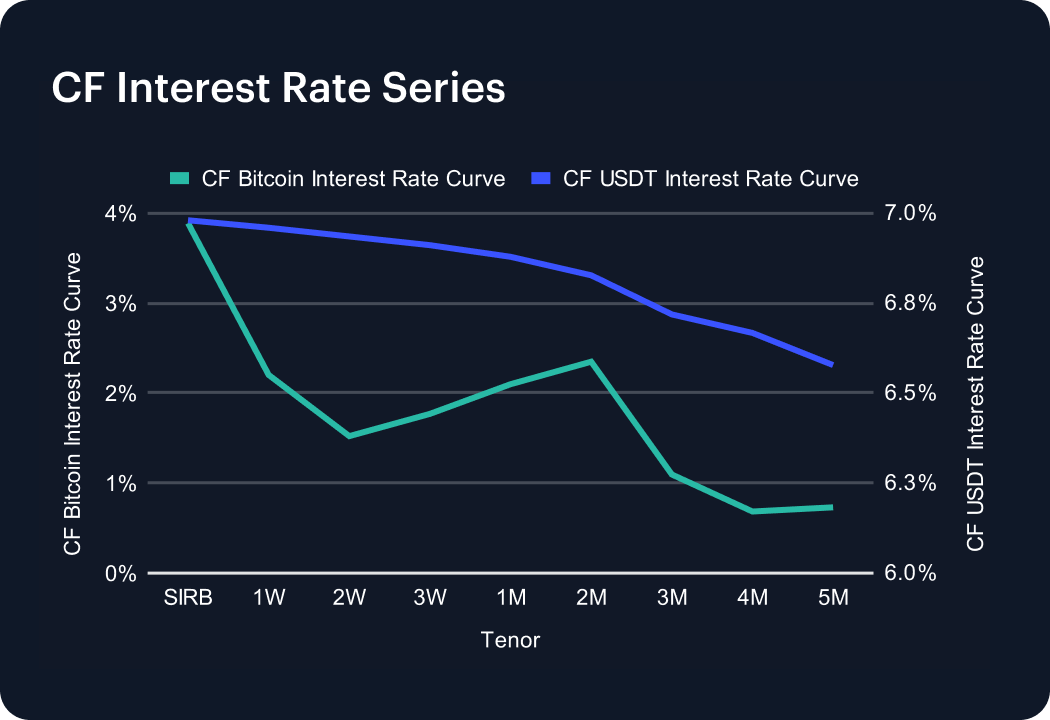 The CF Bitcoin Interest Rate Curve showed a dramatic short-end spike, with the spot implied rate climbing from about 1.6% to nearly 3.9%. In contrast, tenors from one week through five months all declined, with the 1M point dropping to just above 2% and the 3M tenor sliding to near 1%. The net effect was a sharp flattening of the curve, pointing to concentrated demand for immediate leverage while medium-term expectations softened. At the same time, the USDT curve shifted higher across the board, adding roughly 120 bps at each tenor, underscoring tightening conditions in stablecoin funding markets. Together, these moves suggest a market dynamic of short-dated stress balanced by more muted forward expectations.