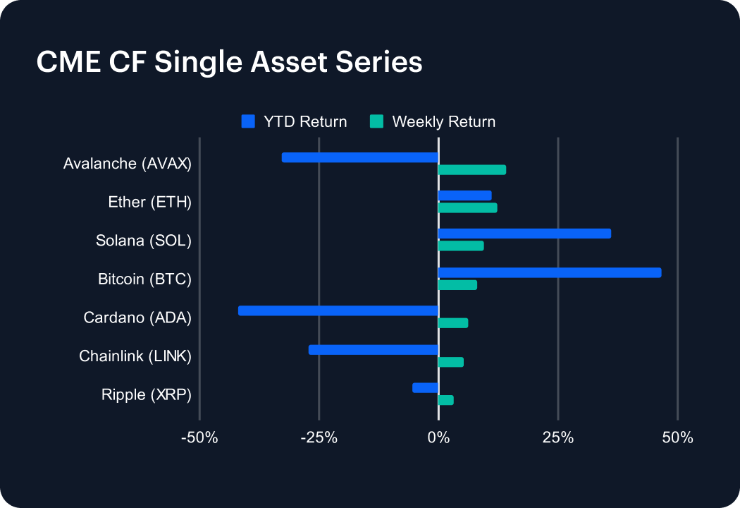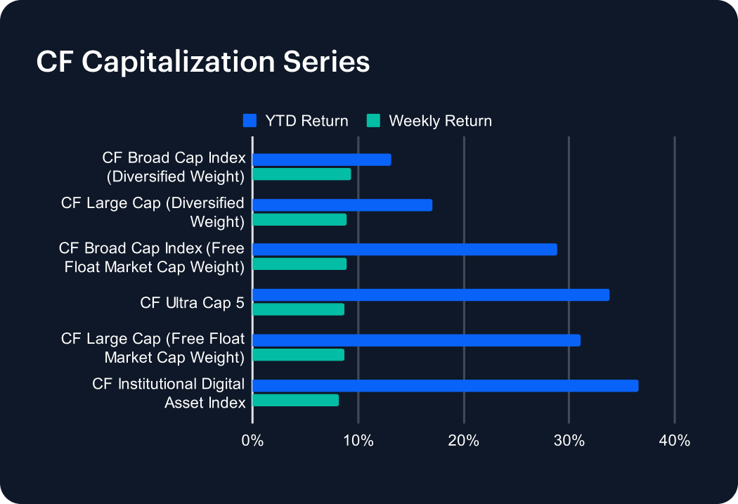 Another week of relatively evenly distributed positive returns across the series, reflecting unequivocally improved sentiment for large caps. The CF Broad Cap Index (Diversified Weight) notionally outperformed, gaining +9.29%, compared with this week’s relative series underperformer, the CF Institutional Digital Asset Index, +8.15%.