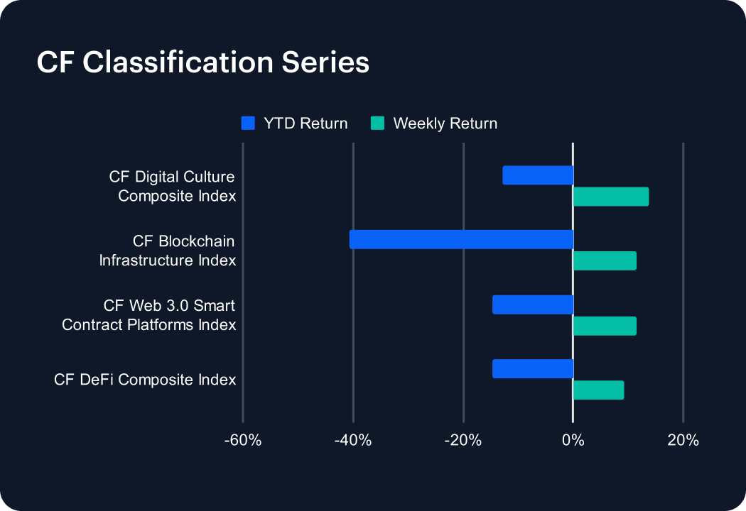 The CF Classification Series posts a similarly positive profile as our Capitalization Series, with all indices rising. The context for CF Digital Culture Composite Index’s +13.79% weekly rise is provided in the CF DACS section of this report.