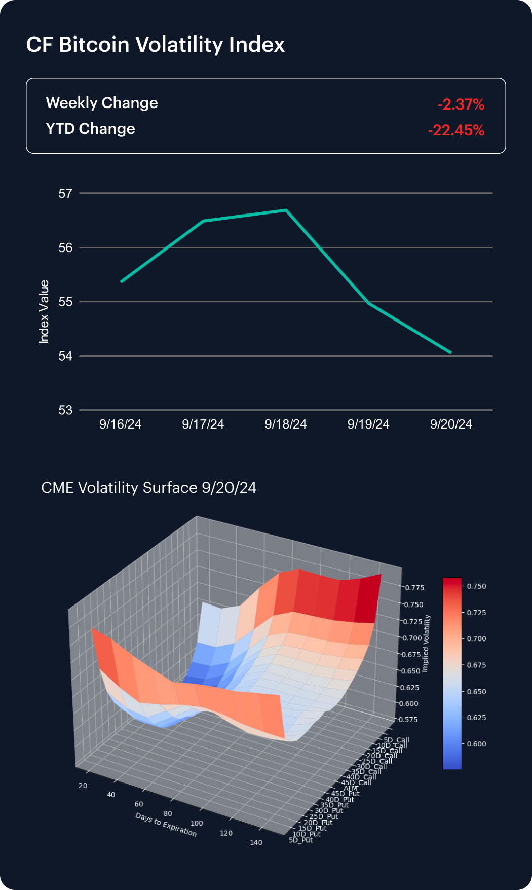 Perhaps symptomatically, widespread gains across large cap cryptos and altcoins, coincided with the continued dispersal of bitcoin implied volatility. The CF Bitcoin Volatility Index Settlement Rate (BVXS) eased -2.37% lower, meaning BVXS’s YTD change worsened to -22.45%.