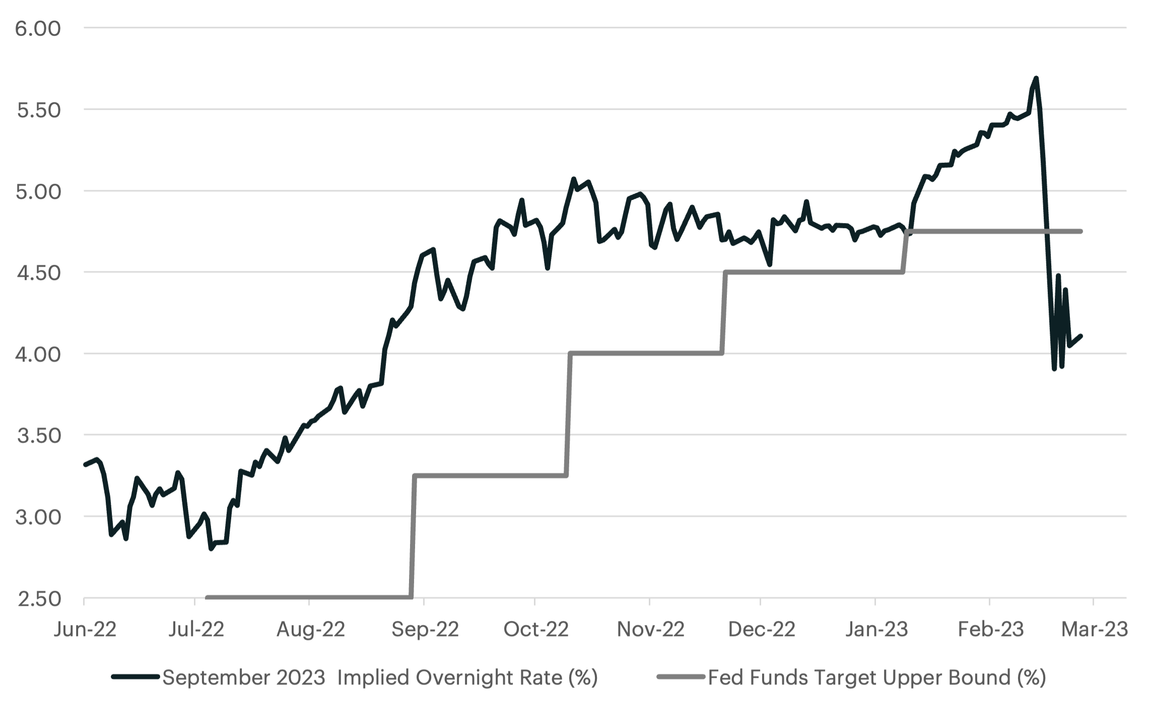 Now let us consider the second catalyst, a repricing in the Fed’s terminal rate. Markets are anticipating that we may be reaching a fed funds peak fairly soon (or perhaps we have already). In our 2023 outlook, we outlined that the Fed may have to cut rates sooner than some forecasters were anticipating. Since then, a few hotter than anticipated inflation prints have countered this initial view, but now that financial stability has come into question, our outlook is beginning to materialize. Below, we highlight the dramatic shift in the futures market implied September Fed Funds Rate, which was the forecasted terminal rate before SVB’s collapse. Markets now anticipate that this benchmark rate will yield approximately 4.0-4.5% come September. This is over 100bps lower from the pre-SVB banking crisis level. Furthermore, the current implied outlook for the Fed’s monetary landscape is for a possible pause in rate hikes, with an eventual 25bps cut coming as soon as mid-2023.