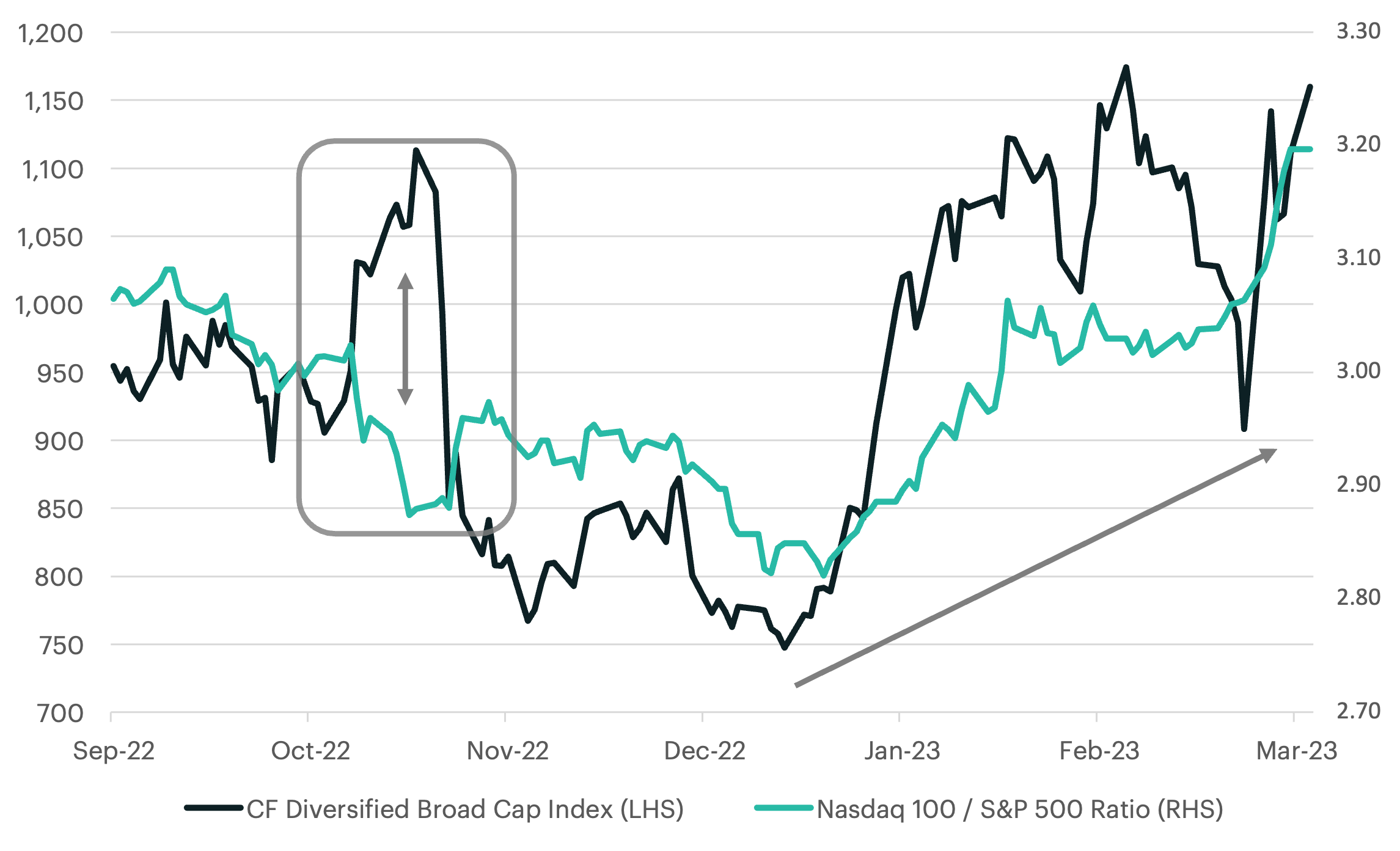 Since the spectacular demise of Silicon Valley Bank (SVB), we have seen a divergence in digital assets compared to other traditional risky assets. For example, the CF Diversified Broad Cap Index has rallied over 27% since the SVB debacle. Meanwhile, the S&P 500 Index is broadly unchanged. So, what are we to make of this dichotomy?